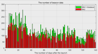 SNUGLITE boroadcasts its health and several data at every 10 seconds. Any one could receive the data using UHF antenna and receiver. Following picture is the number of received beacon data form SNUGLITE cubesatellite. Data were collected with SNU(Seoul National University) ground station and Satnogs amatuers. Satnogs is an open source ground station. We really appreciate to Satnogs efforts.